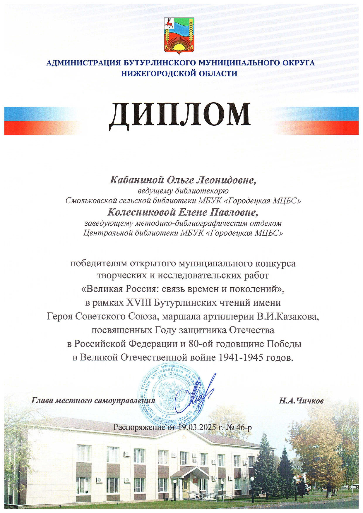 21 марта подведены итоги открытого муниципального конкурса творческих и исследовательских работ «Бутурлинские чтения имени Героя Советского Союза, маршала артилерии В. И. Казакова» - совместная работа Методико-библиографического отдела Центральной библиотеки и Смольковской сельской библиотекой ( Диплом победителей).