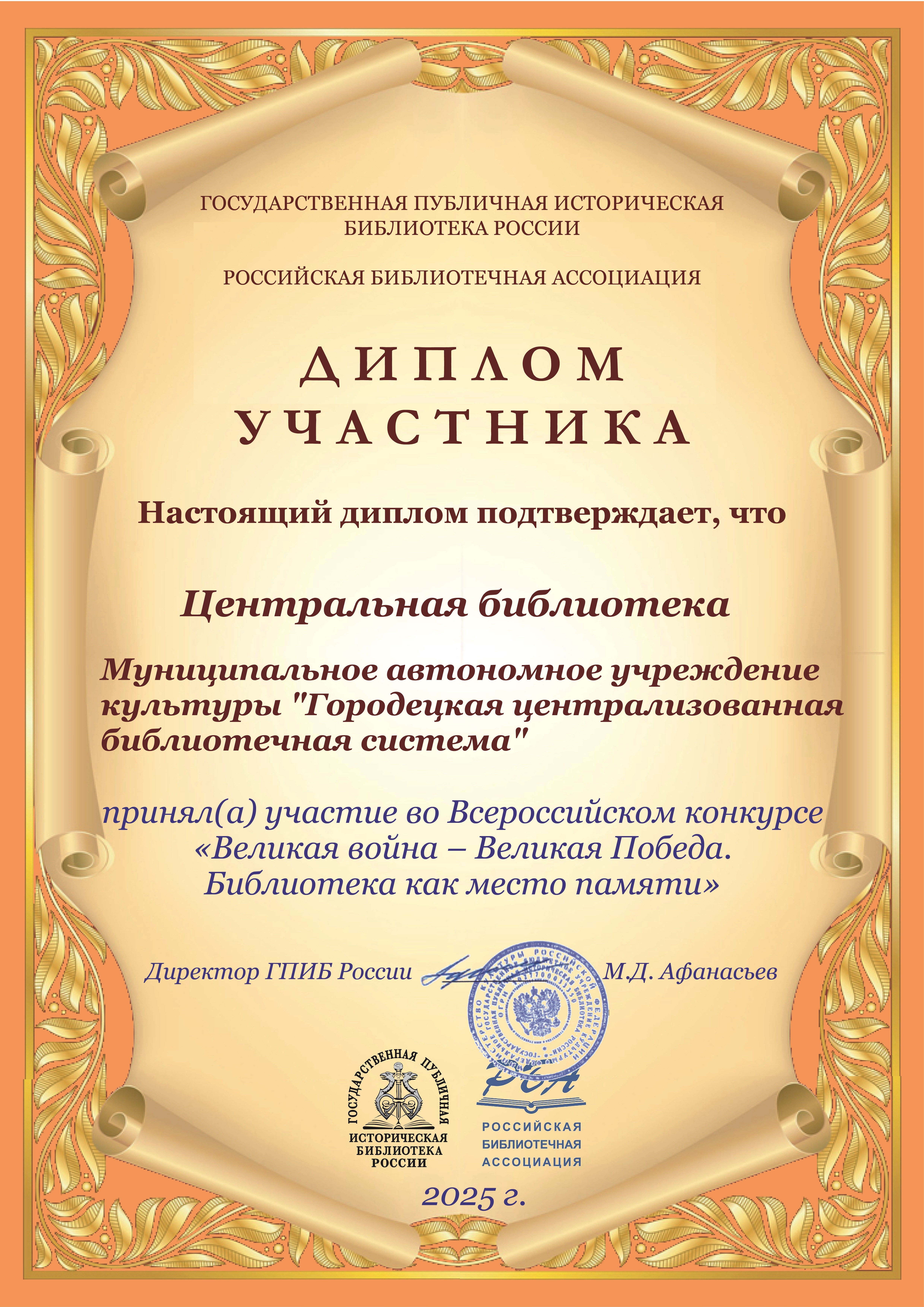 17 июля 2025 года методико-библиографический отдел Центральной библиотеки принял участие во Всероссийском конкурсе библиотечных проектов «Великая война - Великая Победа. Библиотека как место памяти», организованном Государственной публичной исторической библиотекой России при информационной поддержке РБА. Название работы: «Возьми себе в пример героя…»: опыт работы методико-библиографического отдела центральной библиотеки МБУК «Городецкая ЦБС» по организации и проведению окружных конкурсов профессионального мастерства на лучший электронный ресурс к 80-летию Победы, основанный на подвигах городчан - участников Великой Отечественной войны 1941-1945гг. (Диплом участника).
