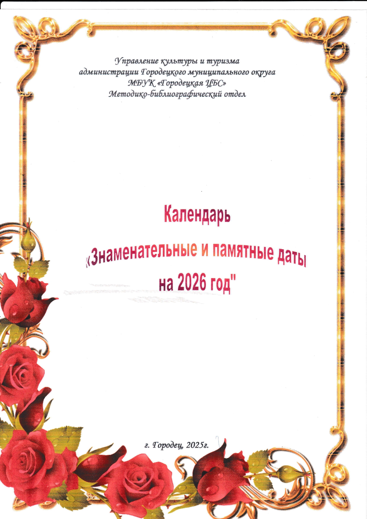 Уважаемые городчане! Муниципальное бюджетное учреждение культуры "Городецкая централизованная библиотечная система" предлагает вашему вниманию календарь знаменательных и памятных даты на 2026 год